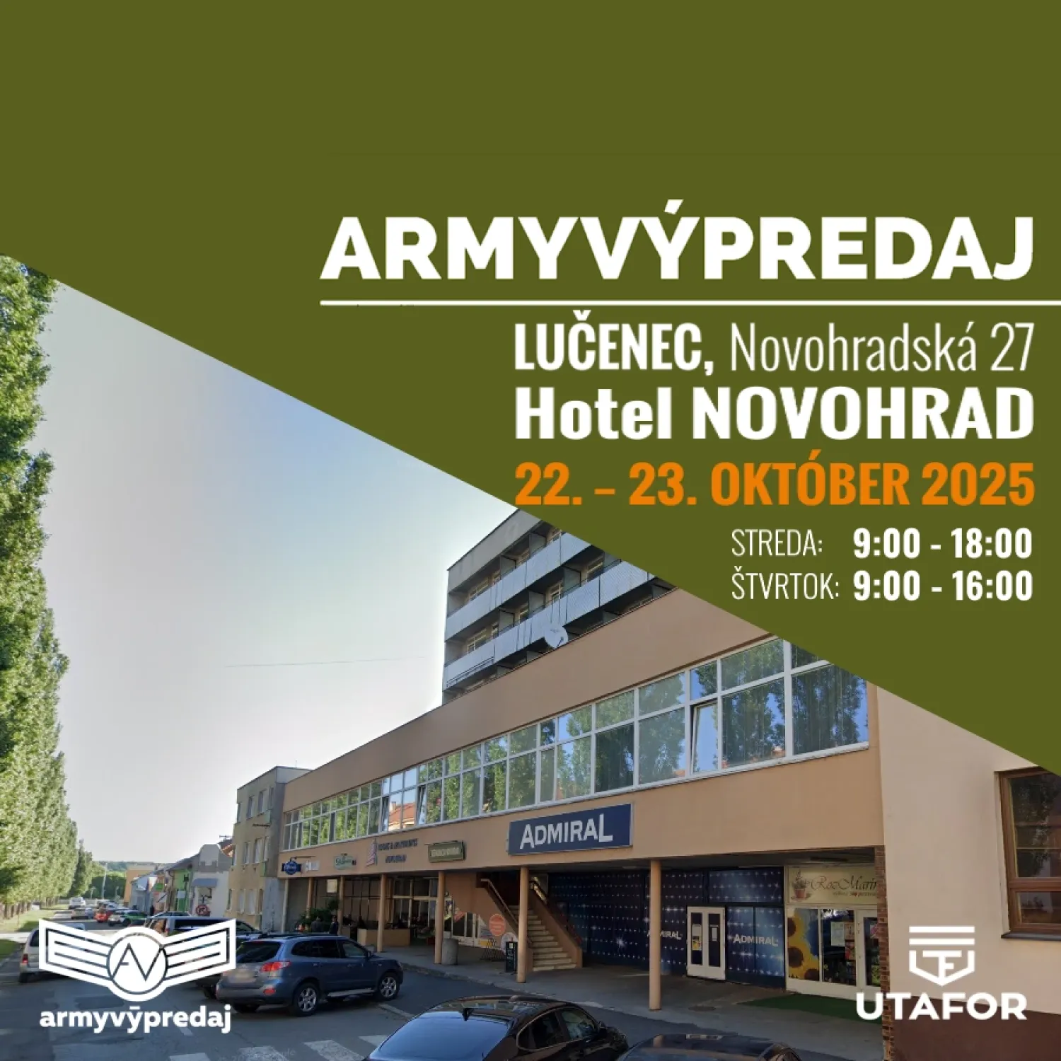 Armyvýpredaj v Lučenci sa uskutoční v sále hotela Novohrad, 1. poschodie (oproti reštaurácii Novohrad), Novohradská 27 - priestranná sála v centre mesta, ľahko dostupná pešo aj autom.