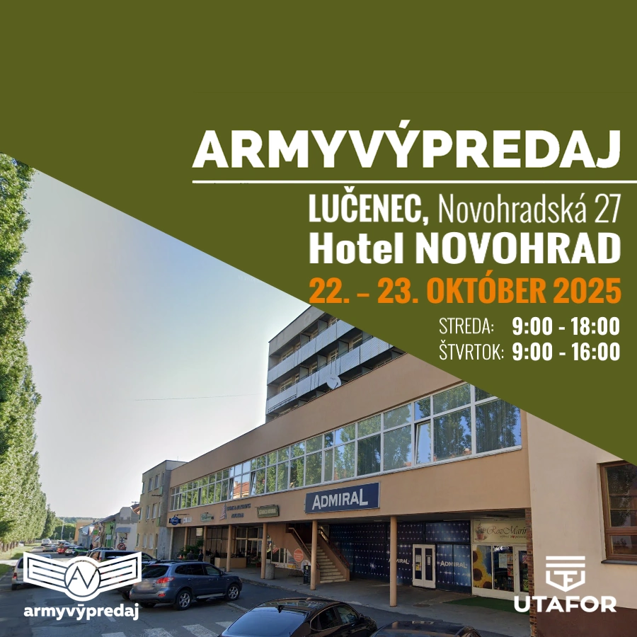 Do Lučenca prichádza veľký army výpredaj! Dvojdňová akcia plná originálneho armádneho oblečenia, obuvi, batohov a doplnkov sa uskutoční 22. – 23. októbra 2025 v sále hotela Novohrad na Novohradskej 27.