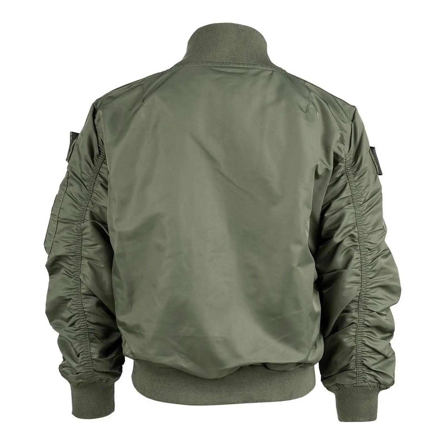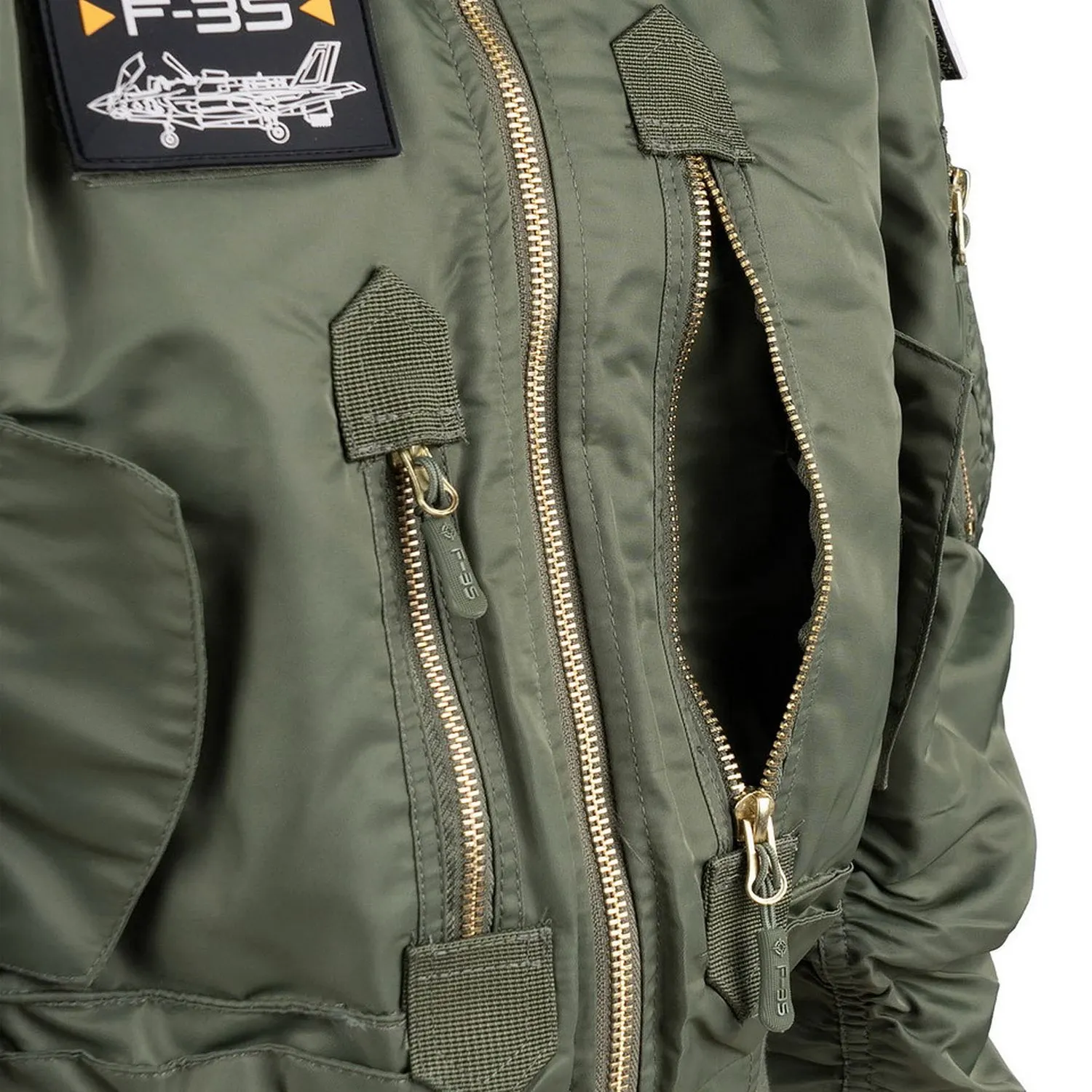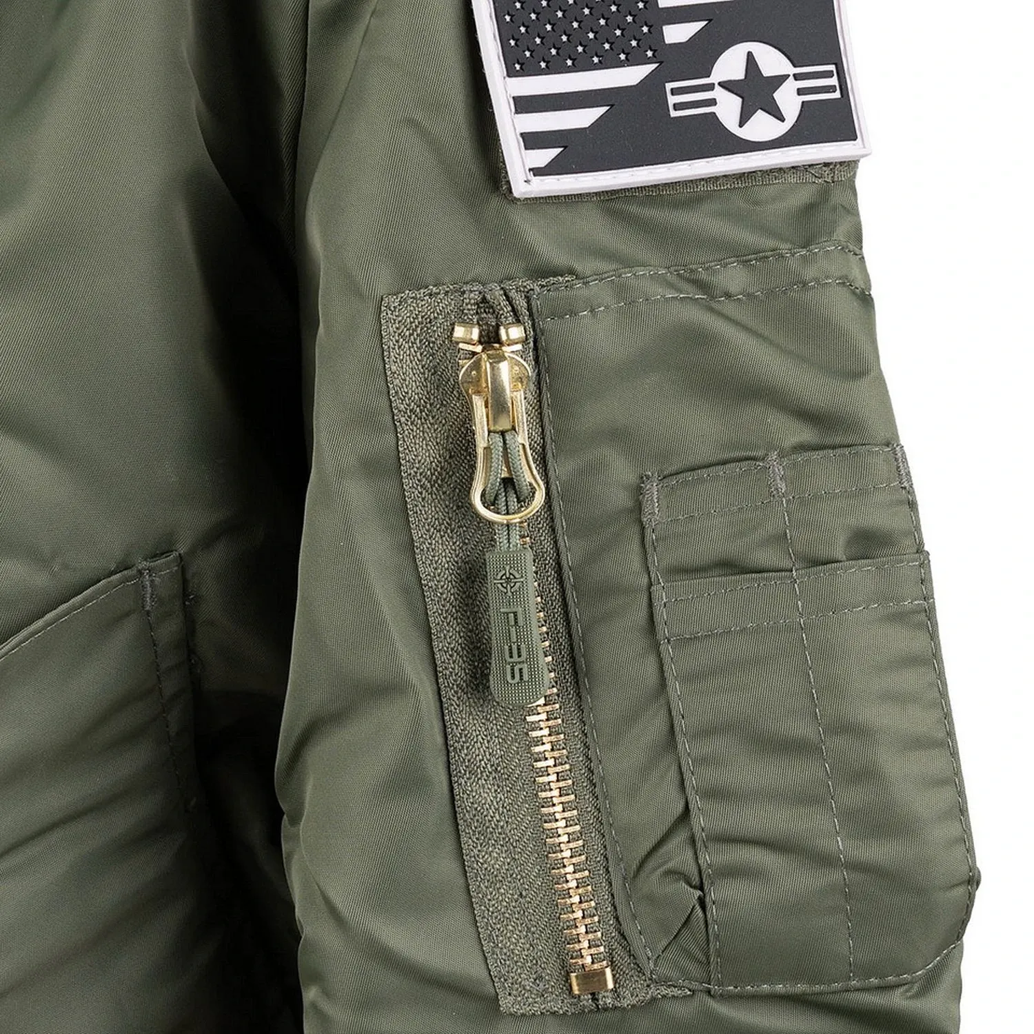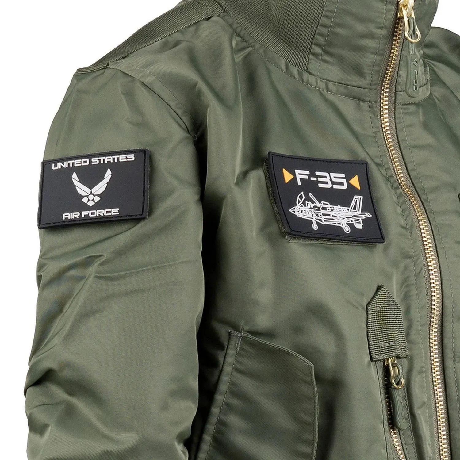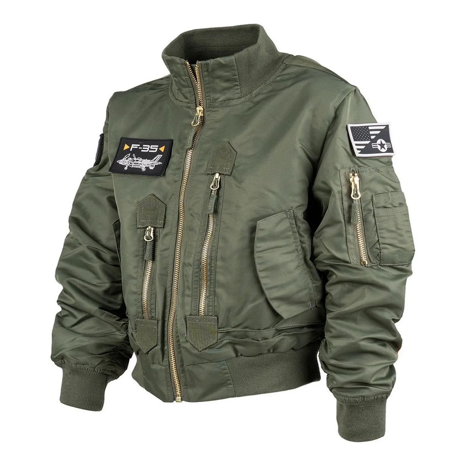 Detská letecká bunda F-35 s nášivkami od výrobcu Fostex Garments je kvalitná bomberka pre deti vhodná na nosenie počas prechodného ročného obdobia. Detská bombera F-35 disponuje 3 nášivkami s motívom amerického letectva, takže deti milujúce armádny štýl, si ju určite zamilujú. Bomberka je vyrobená z nylonového materiálu s polyesterovou podšívkou. Zapínanie detskej leteckej bundy zabezpečuje pevný kovový zips, ktorý vedie až k pletenému elastickému golieru. Praktickou časťou na detskej bombere F-35 je niekoľko vreciek. Hneď na prednej strane sa nachádzajú 2 bočné vrecká s príklopkou na suchý zips a 2 hlbšie vrecká so zapínaním na zips. Vo vnútri nájdeš jedno vrecko na patentku a na ľavom rukáve je ďalšie vrecko na zips a priehradkami na písacie potreby. Miesto pre upevnenie nášivok, či ID v podobe velcro panelov je umiestnené na oboch rukávoch a na hrudníku. Golier, rukávy a spodok detskej bundy F-35 je lemovaný elastickými manžetami.