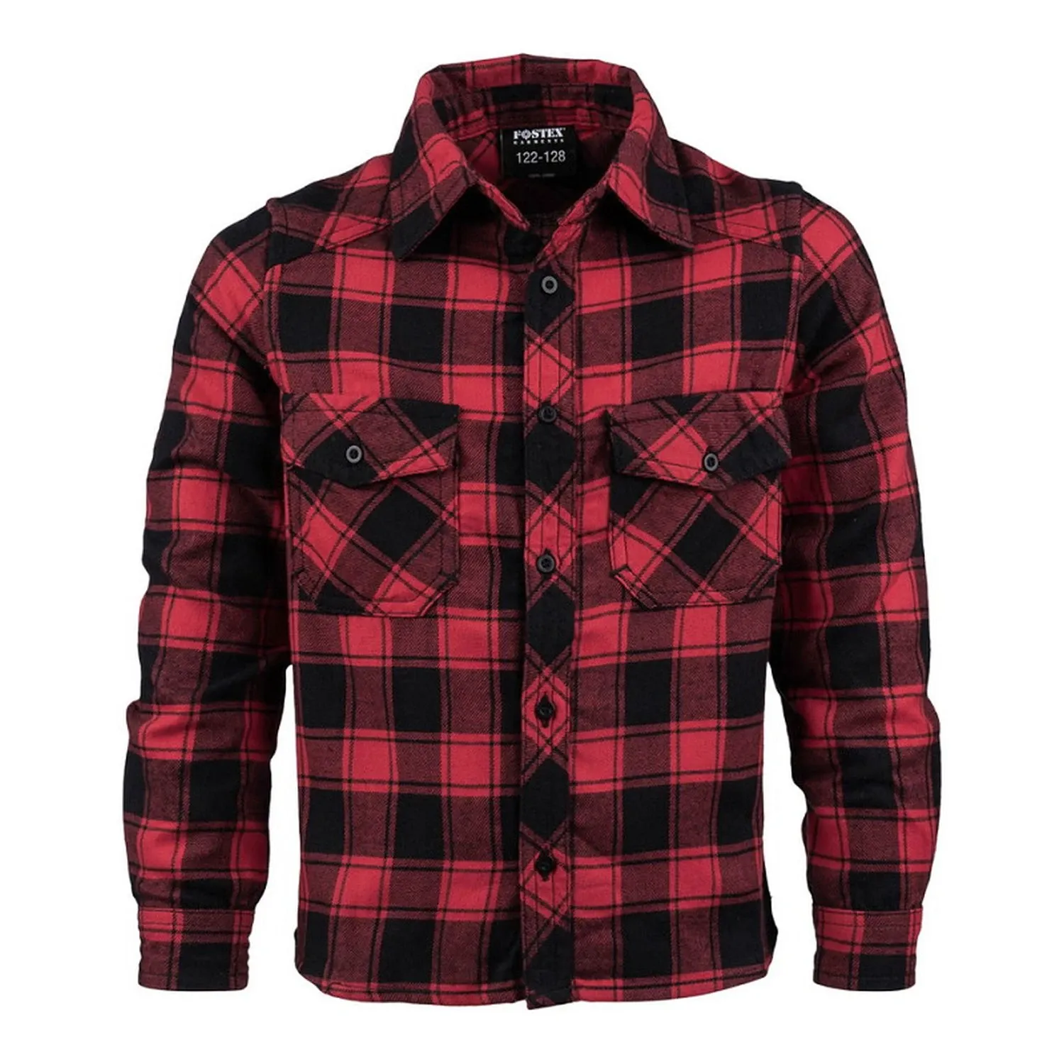 Štýlová detská flanelová košeľa s károvaným vzorom od výrobcu Fostex Garments je vhodná na každodenné nosenie kdekoľvek. Flanelka je vyrobená z príjemného bavlneného materiálu a má klasický golier a zapínanie na gombíky. Na jej prednej strane sa nachádzajú náprsné vrecká s príklopkou na gombík a jej rukávy sa takisto zapínajú na gombíky.